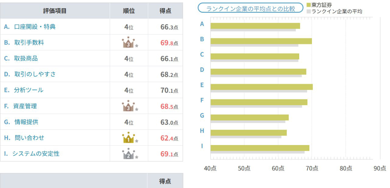過去3年間で年1回以上ネット証券を利用した14,864人の投資家からの調査結果をまとめました。以下に、東方証券を選んだ利用者の声と評価項目の得点を紹介します。